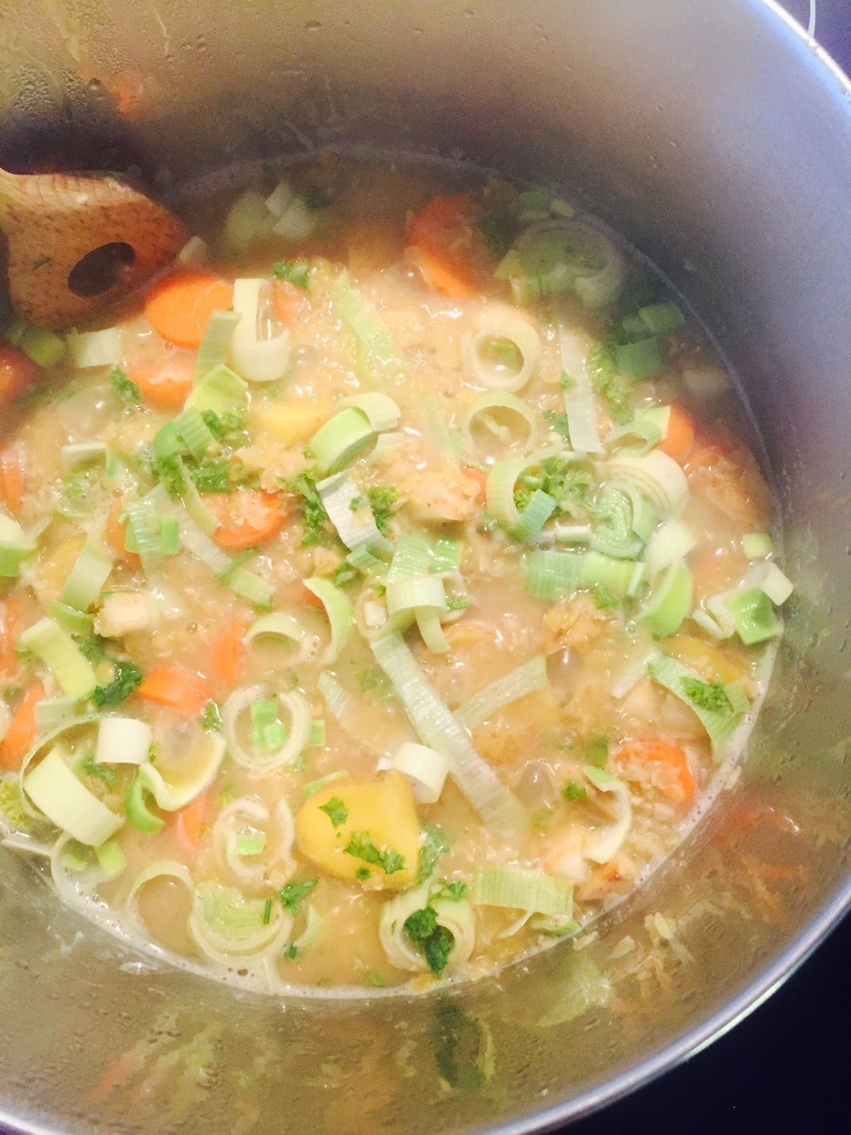 Put the lentil in the same pot! Then add about 750 ml of water and add the ginger, NO SALT! Bring that to a boil and let it cook with the lid on for about 12 -15 minutes. After that 10 minutes add the potatoes, after 15 the rest of the vegetables and let that cook for another 5 minutes.